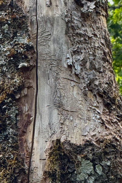Remarque : nombreuses galeries caractèristiques sur un frene mort